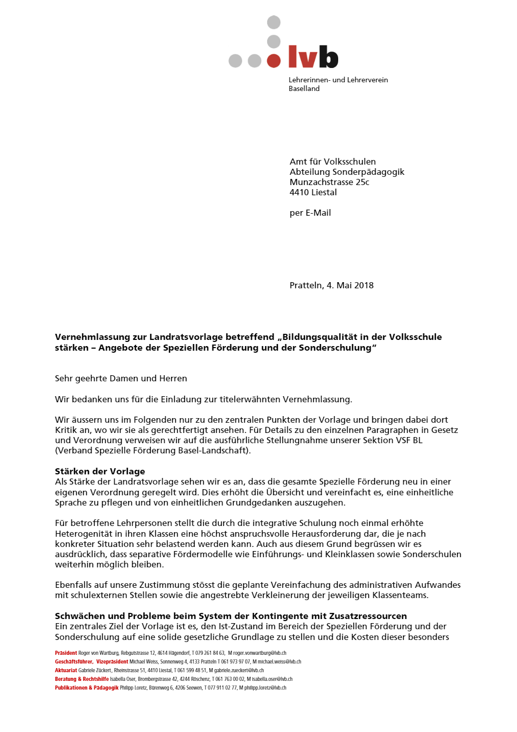 Vernehmlassung zur Landratsvorlage betreffend „Bildungsqualität in der Volksschule stärken…