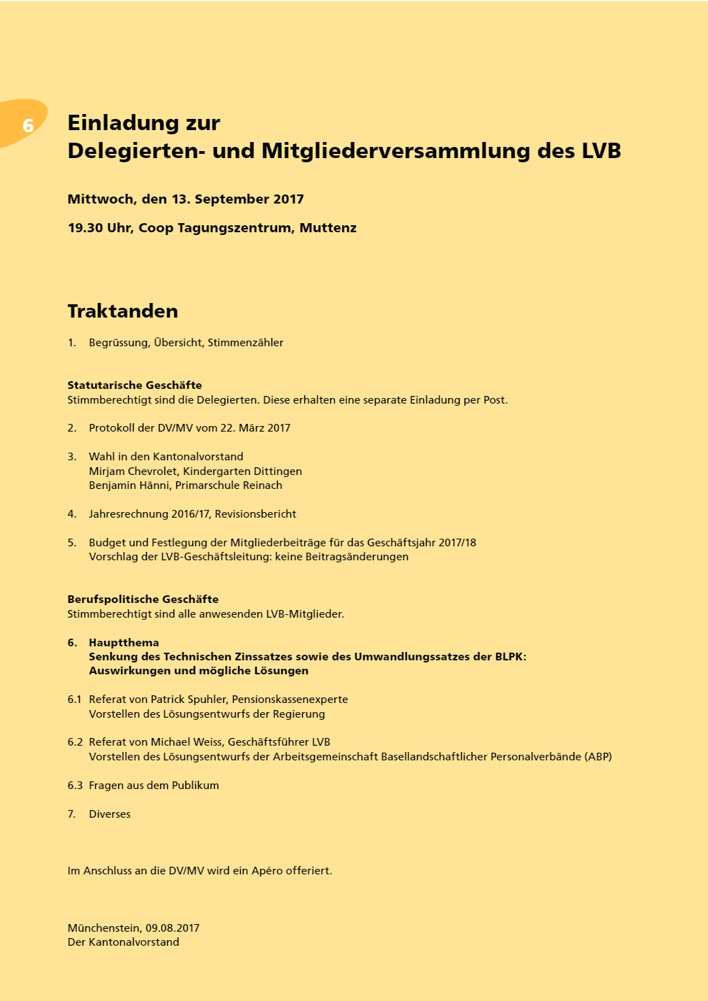 Einladung zur Delegierten- und Mitgliederversammlung des LVB Mittwoch, den 13. September 2017 19.30 Uhr, Coop Tagungszentrum, Muttenz