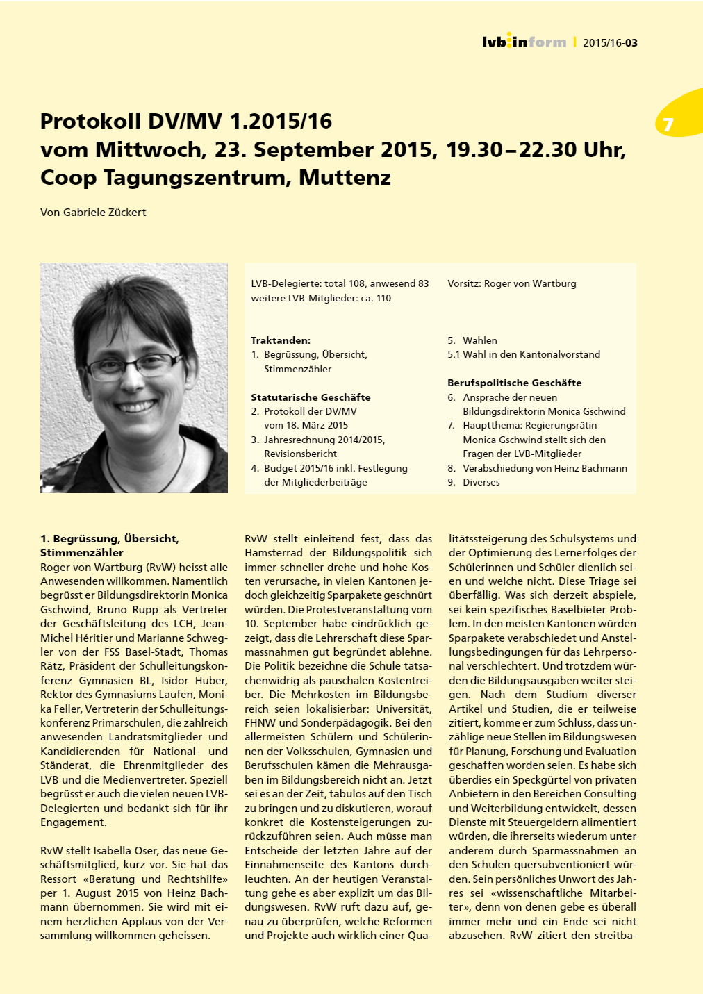 Protokoll DV/MV 1.2015/16 vom Mittwoch, 23. September 2015, 19.30–22.30 Uhr, Coop Tagungszentrum, Muttenz