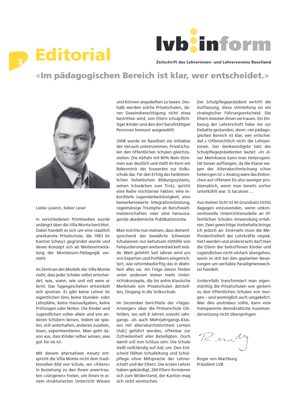 Geschätzte Mitglieder Zum medial in den letzten Tagen omnipräsenten Thema «Lernlandschaften» hat der LVB der «Basler Zeitung» eine präzisierende Stellungnahme