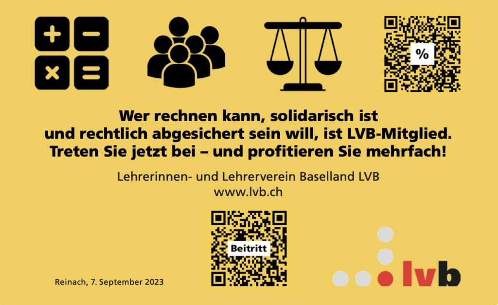 Mit Verlaub: Dieses Argument hält einer näheren Betrachtung nicht im Ansatz stand! Als LVB-Mitglied geniessen Sie beruflichen Rechtsschutz bis hin zur Übernahme von Anwaltskosten und haben eine professionelle Interessenvertretung auf wirtschaftlicher, rechtlicher und politischer Ebene – und darüber hinaus können Sie dank attraktiven Angeboten von LVB und LCH sogar noch ein Mehrfaches des Mitgliederbeitrages einsparen! Eine grössere Win-win-Situation ist gar nicht denkbar!